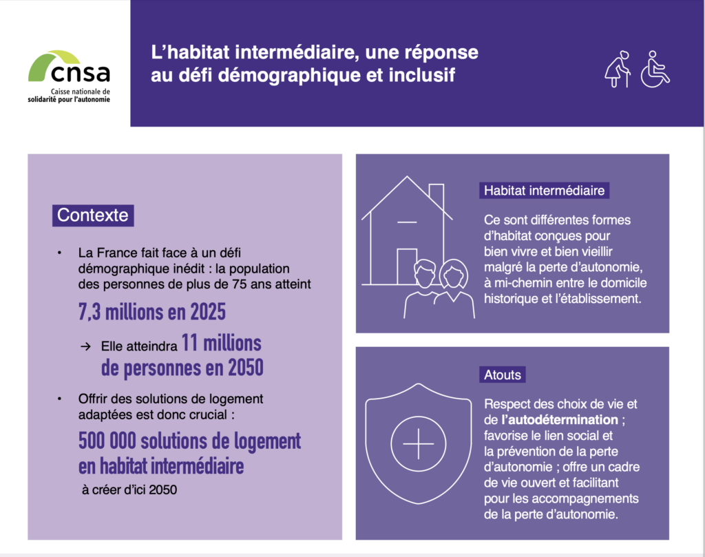 La CNSA publie une infographie sur l’habitat intermédiaire, forme de logement à mi-chemin entre le domicile et l’établissement, conçue pour bien vieillir malgré la perte d’autonomie. Face au doublement attendu de la population des plus de 75 ans d’ici 2050, ce document présente l’état de l’offre existante et les 8 recommandations du Conseil de la CNSA pour développer 500 000 nouvelles solutions sur l’ensemble du territoire.